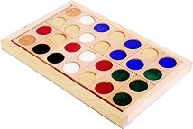 Дървената тактилна дъска е образователна игра, която развива осезанието. Състой се от 8 елемента (4 двойки), които са изработени от различни материали: кадифе, шкурка, филц, въже, пяна, лен, мрежа и вълна. Целта на играта е детето да съчетае кръгчетата с различни текстури в правилни двойки. Изисква се разпознаване на текстурите чрез допир, а съвпаденията се потвърждават чрез цветове. Основата е с размери 23 x 12 cm. ...  |