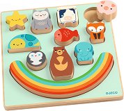 Пъзелът от Djeco ще забавлява малчуганите. Той е изработен от дърво и има заоблени ръбове. Частите му включват мече, пингвин, слон, рибка, звезда, прасе, бухал, крава и дъга. Животните трябва да се наредят в дървена поставка. Те могат да се подредят и върху дъгата. Развийте когнитивните и двигателните умения на вашите деца. Размерите на пъзела са 21 / 21 / 2.5 cm. Етикетът FSC е най-довереният знак в света за устойчиво горско стопанство. Когато купувате продукти с етикет FSC, вие помагате на горите. Суровините, използвани за производството на продукти с лого FSC 100%, са добити от устойчиво управлявани гори и ...