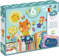 Комплектът от Djeco предлага цели шест творчески дейности за най-малките – колаж с картон, колаж от филц, оцветяване с моливи, оцветяване с вода, цветно разкриване с магическо покритие и скреч карти. Всичко необходимо е в кутията, за да творите спокойно и според темпото и любопитството на детето - илюстрирани основи и дъски за декориране, самозалепващи филцови елементи, тубичка лепило, шаблон, цветни моливи, воден молив, магически карти с покритие за разкриване, скреч карти с дървен инструмент и цветна книжка с инструкции стъпка по стъпка. Резултатът е много часове занимания, които плавно въвеждат различни техники и ... |