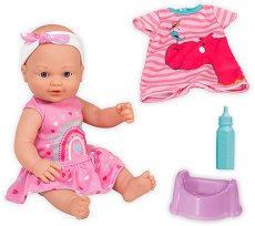 Всяко момиченце обича да играе на майка и бебе. Точно затова куклата бебе ще се хареса на госпожиците. Тя е подходяща за момичета над 3-годишна възраст. Куклата може и да пишка като истинско бебе, за по-реалистична игра. Тялото ѝ е изработено от пластмаса, а крайниците ѝ могат да се движат, благодарение на което може да стои седнала. Бебето е облечено със сладка рокля, а на главата си има лента. Освен това, в комплекта ще откриете гърне, шише и блузка. Когато вашето момиченце сложи своето бебе легнало, то затваря очите си като истинско. Куклата е с височина 35 cm. ... |