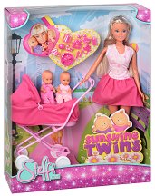 Комплектът е част от серията "Steffi Love", където ще откриете още кукли и аксесоари по темата. ... Куклата Стефи от "Simba" има бебета - близнаци! Тя е най-щастливата майка, защото бебетата са прекрасни. Комплектът е подходящ за деца над 3-годишна възраст и се състои от кукла Стефи, 2 куклички бебета, бебешка количка и аксесоари за хранене - биберон, чинийка, лъжичка, виличка и други. Стефи е облечена с розова рокля на сърчица и е обута с розови сандали на висок ток. Бебетата ѝ са облечени в светло и тъмно розови ританки, за да могат да се различават. Количката е пластмасова и е покрита с ... |