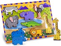 Дървеният пъзел от Melissa & Doug ще се хареса на децата. Върху здравата, дървена дъска има 8 африкански животни, които децата трябва да подредят. За това им съдействат картинките, под формата на всяко от животните. Така децата могат да се ориентират лесно, къде да поставя фигурките. Играта с пъзела спомага за развиването на фината моторика на децата, а посредсвтом фигурките могат да се измислят различни ролеви игри. Пъзелът е подходящ за деца над 2-годишна възраст. ... |