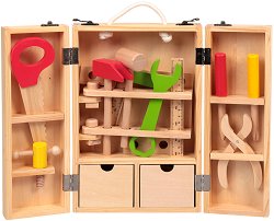 За малките майстори, които мечтаят един ден да използват различни истински машини и инструменти от "Classic World" предлагат на вашето внимание страхотен детски комплект, изработен от висококачествен дървен материал. Той се състои от трион, 2 чука, 2 линии, 2 отвертки, болтове, гайки и още много други инструменти и аксесоари, с които малчуганите ще се научат да завинтват, развиват, сглобяват и свързват внимателно различни по големина и форма елементите. Всички тези елементи са събрани в дървен куфар, който служи както за съхранение и пренасяне на компонентите, така и за работен тезгях. Той разполага с 2 ... |