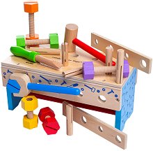 Искаш да си майстор като татко, но той не ти дава своите инструменти? Няма проблем! Специално за малките майстори от Bigjigs Toys предлагат комплект, състоящ се от кутия с инструменти и болчета, която се трансформира на работна маса. Той включва части за сглобяване на маса, инструменти и консумативи, измежду които гаечен ключ, чук, винтове и други. Инструментите и работилницата са изработени от дърво и са боядисани със специални безвредни бои на водна основа. Да вървим да майсторим! Сглобената масичка е с размери 27.9 / 13 / 13 cm. ... |