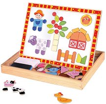 Магнитната дъска от "Tooky Toy" е на тема "Ферма". Тя ще зарадва всяко дете, което обича да измисля различни истории. Комплектът съдържа магнитна дъска, която служи за капак на кутията и дървени магнитни фигурки за редене. Магнитните фигурки са различни по форма и цвят. С тяхна помощ могат да се "рисуват" различни животни, къщи, растения и хора, а детето ще развива своето въображение, докато разказва истории на своите приятели. ... |