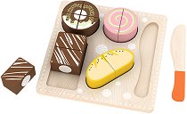 Комплектът за игра от "Smart Baby" е изработен от дърво и е боядисан с безвредни бои на водна основа. Той е подходящ за малчугани над 3-годишна възраст. С него децата ще се научат да "режат" сладкиши, а освен това, ще могат и да играят на "готвач" или да включат комплекта в своя магазин. Всеки елемент е от две или повече части, съединени с велкро лепенка (лепящ цип). Така детето лесно ще може да ги разполовява с помощта на дървеното ножче върху дъската. Забавлението е гарантирано! Дъската е с приблизителни размери 18 x 18 cm. ... |