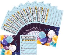 Комплектът се състои от 10 покани подходящи за рожден ден. На тях могат да се изпишат името на рожденика, за кого е поканата, датата, часът и мястото на събитието, както и телефонен номер за връзка. Всяка от поканите е с размери 11.5 x 7.5 cm. ... |