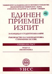 Ръководство за самоподготовка с примерни тестове. ... Въвеждането на единен приемен изпит (ЕПИ) за кандидатстване в Университета за национални и световно стопанство, Икономическия университет - Варна, и Стопанската академия Д. А. Ценов - Свищов, се осъществява съгласно решения на академичните съвети на тези университети. Тестовите примерни въпроси в настоящия сборник са единни за трите университета. Всеки университет определя обаче самостоятелно конкретната организация и датите на провеждане на изпитите, както и по кои от специалните модули (математика, литература, икономика, история и география) ще се провеждат изпити ... |
