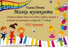 Специализирана школа по пиано, солфеж, теория и история на музиката за деца от 3 - 7 години. ... "Книжка последна от настоящата поредица школи по пиано. Завършвайки я, детето логично ще може да продължи по друга школа, след правилна оценка на нивото на неговите знания, умения и характер. Необходимо е то да има учител. Все още е нужна помощта на родителя, що се отнася до разчитането на задачите и кратките упътвания, ако детето още не знае да чете, или в насочването и конкретизирането на мисълта му. В книжка осма се встъпва вече в по-задълбочени теоретични и практични знания, като се утвърждават получените в предишната ... |