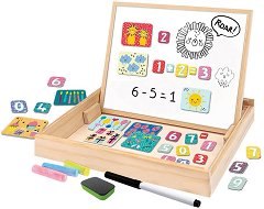 Не е тайна, че децата се учат най-лесно с помощта на игра. Точно затова комплектът от "Tooky Toy" ще се хареса на всяко дете. Той е подходящ за малчугани над 3-годишна възраст и се състои от магнитна кутия, 4 шаблона с магнити, 26 карти с букви, маркер и кърпичка за триене. Кутията играе ролята на дъска - щом се отвори, тя разкрива черна дъска, по която да се лепят магнитите. Как се изписва котка на английски? Ами лъв или куче? Картите имат отговорите на тези и още въпроси. Опитайте първо да изпишете конкретната дума с помощта на магнитите на дъската, а след това упражнете и правописа ѝ на картите с ... |