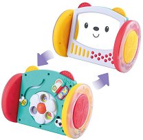 Детската играчка от PlayGo ще привлече вниманието на вашето дете с пъстрите си цветове, форми и звуци. Централната ѝ част има безопасно огледална повърхност от едната страна, а от другата - въртящо се колело, пеперуда с подвижни криле и лабиринт с пчеличка. От двете страни играчката е снабдена с колелца. Оранжевото колело може да се върти и да издава щракащи звуци, а жълтото има лилава ролка, която играе роля на дрънкалка. Играчката с огледало стимулира и развива моторните умения, зрителни сетива, физическа способност и координацията в детето. Тя е напълно безопасна, тъй като е изработена от пластмаса. ...