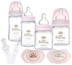 Комплектът за новородено от серията "Royal Baby" на "Canpol babies" съдържа шишета за хранене, силиконови биберони, залъгалки и клипс за залъгалка. В комплекта са включени 2 шишета от 120 ml, които са в комплект с биберони за бебета от 0+ месеца и 2 шишета от 240 ml, които са с биберони за бебета над 3 месеца. Шишетата са изработени от висококачествен полипропилен, който е безопасен и устойчив при продължителна употреба, и са с широко гърло, което улеснява тяхното пълнене и почистване. Те са леки и прозрачни, а специалната им форма осигурява комфорт при използване. Могат да се използват в микровълнова, ... |