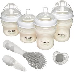 Комплектът за новородено на Vital Baby съдържа шишета за хранене, силиконови биберони, залъгалка и четка за шишета и биберони. Бебешките шишета в комплекта са с вместимост 150 ml и 240 ml. Те са изработени от полипропилен и имат широко гърло, което улеснява тяхното пълнене и почистване. Бибероните към тях са произведени от 100% мек силикон със зона Flexzone, която, за максимално естествено усещане, позволява да се разтягат и огъват точно като майчиното зърно. Бибероните са с бавен поток на течността Slow Flow и са подходящи за бебета от 0+ месеца. Те са специално проектирани да наподобяват естествения процес на кърмене, ... |