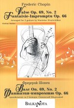 Аранжимент за две китари - Станислав Хвърчилков. ... Фредерик Франсоа Шопен е полски композитор от периода на Романтизма и виртуозен пианист, най-известният представител на полското музикално изкуство и един от най-великите творци в историята на музиката. Той поддържа световна известност като водещ музикант на своята епоха, истински поетически гений с професионална техника, която няма равна в своето поколение. Подобно на Моцарт, той е дете-чудо и свири на пиано и композира от ранно детство, като всичките му композиции включват пианото. Повечето са за соло пиано, макар че написва два концерта за пиано, няколко камерни ... |