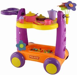 Количката за сервиране разполага с четири колела, два рафта, специална дръжка за бутане и поставка за ваза с цветя. Комплектът се състои от тенджера, тиган, кана, чинийка, прибори за хранене, солници, цветя и други аксесоари. Всеки елемент е изработен от висококачествена пластмаса. Модерният дизайн и ярките цветове ще се харесат на всяко момиченце. ... |