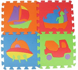 Пъзелът се състои от 10 меки елемента. Всеки елемент е изработен от EVA пяна и с размери 30 x 30 cm. Всеки един от елементите има картинка с различни превозни средства. Така в процеса на игра, детето ще се запознае с всяко от тях. При подреждането на пъзела се получава мек килим, който е идеален за игра. ... |
