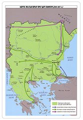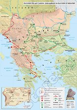 Стенна историческа карта на България при цар Иван Александър 1331 - 1371 и врезка - България през втората половина на XIII век. Характеристики на картата: географска мрежа; хидрография; територия на България в началото на управлението на цар Иван Александър, териториално разширение по време на неговото царуване, територии на съседните държави, представени чрез фоново оцветяване и щриховка върху сенкорелеф; граници на царствата; български военни походи срещу Византия; военни походи срещу България на сърби, византийци, унгарци и граф Амедей VI Савойски; османски нашествия; битки и превземане на селища; столици и ... |
