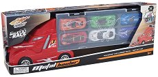 Комплектът съдържа автовоз и 6 броя колички. Страничният капак на автовоза се отваря, а кабината на камиона служи като рампа за спускане на количките. Играчките са подходящи за деца над 3-годишна възраст. Размерите на автовоза са приблизително 38 / 8 / 14 cm. Освен това в комплекта е включен килим за игра. ...