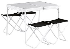 Комплектът на "Easy Camp" е изключително практичен вариант за семеен къмпинг или пикник. Състои се от маса и 4 сгъваеми столчета, изработени с олекотена стоманена конструкция. Масата се сгъва до компактни размери във вид на плосък куфар с дръжка. Заема незначително място на дъното на багажника, а осигурява всичко необходимо за пикник и къмпинг за четирима. Характеристики: бързо и лесно разгъване подходящ за 4 човека олекотена стоманена конструкция размер на масата - 70 / 86 / 65 cm размер на стола - 35 / 36 / 40 cm размер в сгънато състояние - 70 / 43 / 12 cm тегло - 9.80 kg ... |