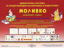 Табло за детската градина за деца на 6-7 години. ... Таблото Моливко съдържа теми за технологични операции за обработване на технически материали: Хартия и картон Природни материали Текстилни материали Метални материали Технически комплекти Строителни комплекти Размерите на таблото са: 46.7 x 34.2 cm. Дидактичната система Моливко за подготвителна група се състои от: помагало Обичам те, българска реч помагало В страната на математиката помагало Родна реч помагало С Моливко в страната Логика помагало С Моливко играй и мисли помагало Прозорче към света помагало От земята до небето помагало ... |