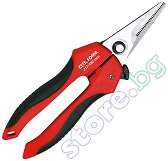 Универсална ножица, подходяща за употреба в градината и дома, служеща за градинарски, строителни и ремонтни дейности. С нея можете да режете различни повърхности и материали - цветя, малки клони, пластмаса, картон, текстил и други. Острието на ножицата е изработено от неръждаема стомана, а тялото ѝ е от пластмаса. Режещата част на острието е с дължина 5 cm. Дръжката на инструмента е с ергономична форма, която осигурява комфорт по време на работа. Пружинният механизъм осигурява плавно опериране на ножицата. Има заключващ спусък, с който можете да държите ножицата затворена за по-голяма сигурност. Отворът в долния ... |