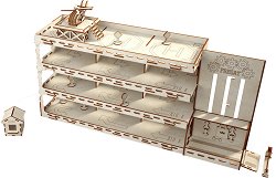 С комплекта от Woodpy детето ви ще може да построи четириетажен паркинг за любимите му превозни средства. Той се състои от лазерно изрязани елементи, произведени без употреба на бои и вредни пигменти. Те са изработени от брезово дърво, което е приятно на допир и се разгражда в природата по-бързо от пластмаса. Към комплекта са предвидени и части за сглобяването на хеликоптер, пътни знаци, бариера и пункт за охрана, с които паркингът може да бъде обзаведено. Освен всичко това в кутията ще откриете картинни инструкции, за последователността на сглобяване на елементите. При сглобяването им е необходимо ушичките да изщракат ... |