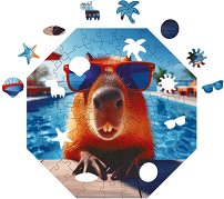 Пъзелът от Milliwood е красив и цветен. Изработен е от дърво и е прибран в дървена кутия. Състои се от 90 части и е с нестандартна форма. На картинката е изобразен чаровно грозната капибара Swimpybara. Тя има специална сила - може да накара всички около себе си да се чувстват щастливи и спокойни. Преди всичко Swimpybara обича да пътува по света и да посещава различни места, където присъствието й носи радост и спокойствие. Последната й спирка беше тропическа ваканция, където всяка сутрин излизаше от басейна, за да се наслаждава на слънцето и компанията на нови приятели. Комплектът включва осем специални части във ...