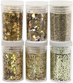 Сухият брокат от Creativ е подходящ за декорация на картички, покани, подаръци, предмети за декориране и различни скрапбукинг проекти. Може да се прилага върху картон, хартия, дърво, стиропор, текстил и други повърхности. Фиксира се с лепило, лак или боя. Сухият брокат се предлага в комплект от 6 броя в златист цвят с различни форми - звезди, сърца, лентички, ромбове, точки и фини частици. Всеки дизайн е поместен в пластмасов контейнер с капаче. ... |