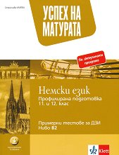 Профилирана подготовка за 11. клас и 12. клас. ... Помагалото от поредицата Успех на матурата на издателство Клет България - Немски език. Примерни тестове за ДЗИ е предназначено за подготовка на ученици за държавен зрелостен изпит по немски език (профилирана подготовка), ниво B2. Изданието включва: седем теста по актуалния формат за втория задължителен държавен зрелостен изпит след профилирано обучение по немски език; задачи от всички изпитни компоненти, съобразени с примерните задачи, публикувани от МОН; информация за изпитния формат, оценяваните компетентности и стратегии за успешно справяне с различните ... |