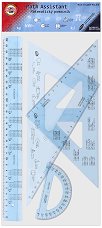 Комплект за чертане, изработен от прозрачна пластмаса с напечатани формули върху триъгълниците и линията. Подходящи са за чертане с изографи, химикалки и автоматични моливи. Характеристики: линия - 30 cm транспортир - 0 - 180° правоъгълен триъгълник с хипотенуза 22 cm равнобедрен триъгълник с хипотенуза 16 cm ...
