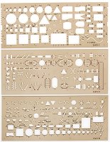 Комплектът шаблони за чертане на електрическа инсталация се състои от три отделни шаблона. Всеки един от тях е с размери 21 x 9 cm и е изработен от прозрачна бежова пластмаса. Шаблон I съдържа общи символи: кръгове триъгълници квадрати правоъгълници диаграма на поток на данни синусоидни символи символи за полярност в различни размери Шаблон II съдържа символи на електронна схема: кондензатор превключвател трансформатор терминали транзистор резистор Шаблон III съдържа символи на електрическо оформление в различни размери. Степента на прозрачност на шаблоните позволява прецизно следене на чертежа ... |
