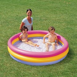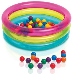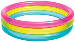 Направете къпането и играта на Вашия малчуган още по-забавни, като му подарите този цветен бебешки басейн от "Intex"! Той е с дълбочина 25 cm и има три хоризонтални надуваеми пояса с диаметър от 86 cm, като всеки един от тях е в различен цвят - розов, жълт и син. Детското басейнче може да се използва както на плажа, така и у дома. А в студените месеци може да се превърне в страхотно място за игра, като се напълни с разноцветни топки. Препоръчва се поставянето на басейна върху специална подложка за басейн, тъй като асфалтът или друга твърда повърхност могат да доведат до повреда или спукване. За да надуете ...