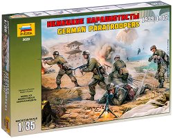 Комплект от 5 мащабно умалени фигури от пластмаса на германски парашутисти от "Втората световна" война на "Zvezda". Действието се развива в периода от 1939 до 1942 година. Идеалният аксесоар, с който можете да допълните вашата колекция. Брой части: 72. Средна височина на фигурата: 50 mm. Мащаб на комплекта: 1:35. За да може да сглобите и залепите този макет, ви е необходимо лепило. Елементите на модела са направени от едноцветна пластмаса. Моделът може да се оцвети с боички. Препоръчани боички от производителя за оцветяване на модела - "Humbrol": 33 Black 62 Leather 110 Natural ... |