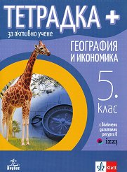 Тетрадка по география и икономика за 5. клас съдържа система от въпроси и задачи, разнообразни по характер и сложност. Чрез тях се постигат: по-задълбочено разбиране и осмисляне на учебното съдържание, усвояване на понятията и водещите идеи, заложени в учебната програма, прилагане на знанията и уменията в сходни ситуации. Въпросите и задачите са със структуриран, с полуструктуриран, със свободен отговор, за извличане на информация от схеми, климатограми, хидрограми, за работа с контурна карта, за изчертаване на графични изображения и други. Учебната система по география и икономика за 5. клас се състои от: ... |