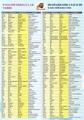 И безплатен звукозапис в YouTube. ... Неправилните глаголи са останали в съвременния английски език от старо-английската система за спрежения. Наричат се неправилни, защото образуват своите форми за Past Simple и Past Participle не по правилата. Тоест, не чрез добавяне на -ed, или -d към Infinitive или чрез промяна на y в -ied. Някои от тях имат едновременно правилна и неправилна форма. Количеството на тези глаголи (около 200 разпространени) е значително по-малко в сравнение с десетките хиляди правилни глаголи. Неправилните глаголи изразяват обикновени, ежедневни и познати действия и състояния. Те трябва да се знаят ... |