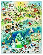Фриц Баумгартен, един от най-известните немски илюстратори на детски книги, очарова със своите цветни и весели илюстрации от поколения насам. Върху картината на адвентния календар "Четири сезона" са разположени капачета - по едно за всеки ден от началото на декември до Коледа. Под всяко капаче има тематична картинка, свързана с коледните празници. На гърба на календара мотивът е показан отново без вратички, така че все още да може да се използва като декорация и след празниците. Размерите на адвент календара са 43 x 55 cm. ... |