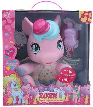 Сладкото приказно пони на име Кони ще грабне вниманието на вашето дете. Тялото на играчката е изработено от мека материя, а крилете му от лъскав текстил. Щом детето натисне дясното краче на понито, то ще започне да пее песнички, а при натискане на лявото краче ще започне да разказва приказни. Когато детето натисне коремчето на играчката, тя ще издаде забавни звуци. Към комплекта са включени и няколко аксесоара за Кони - шише с мляко и сладка шапчица, която свети. Детската играчка работи с 3 броя батерии 1.5V AAA, които са включени в комплекта с демонстративна цел. Препоръчва се те да бъдат подменени с нови, преди детето ...