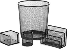 Комплектът органайзери за бюро е в стилен черен цвят и изработен от метална мрежа. Благодарение на поставката за хартиени кубчета, моливника и поставката за визитки и по-големи листчета бюрото в офиса или у дома ще бъде винаги подредено. Поставките и моливникът са с крачета, които не позволяват плъзгане по бюрото - така всичко ще бъде на мястото, на което сте го поставили, без да се притеснявате, че нещо може да се размести, ако го бутнете леко. Четвъртата част от комплекта е метален кош с обем 12.8 литра, който е идеален за изхвърляне на ежедневните боклуци - смачкани листове, стари документи или друго. ... |