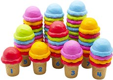 Комплектът е подходящ за обучение в предучилищна подготовка. Той включва 10 фунийки и 55 цветни топки сладолед. Фунийките са номерирани с числата от 1 до 10. Върху тях могат да се поставят цветните топки. Целта на упражнението е броят на цветните топки да отговаря на числото на фунията. Децата могат да се научат да броят и сортират като по този начин обогатяват своите математически и логически умения. Приблизителната височина на фуниите е 5 cm. ... |