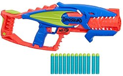 Бъди готов за битка с бластера Dinosquad: Terrodak от Nerf! Комплектът съдържа бластер и 12 стрелички от пяна. Моделът притежава 4 цеви, което позволя да изстрелвате 4 стрелички последователно. Заредете четирите цеви, издърпайте помпата в долната част на бластера, а след това натиснете спусъка, за да стреляте с всяка една поотделно. Освен това задната част на модела е изработена с поставка за стреличките. Така ще можете да презаредите вашия бластер по-бързо. Играчката е подходяща за игри както на открити, така и на закрити пространства. ...