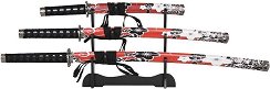 Комплектът самурайски мечове катана, вакидзаши и танто White Flower на Haller Stahlwarenhaus е изработен с внимание към детайла и традицията на японските оръжия. Остриетата са направени от въглеродна стомана с декоративен режещ ръб. Ръкохватките от пластмаса осигуряват удобен захват, а дървените кании допълват класическия стил на комплекта. Характеристики: дължина на острието на катана: 68 cm обща дължина на катана: 93.5 cm дължина на острието на вакидзаши: 48 cm обща дължина на вакидзаши: 71 cm дължина на острието на танто: 28 cm обща дължина на танто: 45 cm материал на острието: въглеродна стомана материал ... |