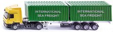 Камионът Mercedes Mercedes Actros на "Siku" е с дължина 23.5 cm. Мащабът на камиончето е 1:50. Играчката е изработена е от метал и пластмаса и е с изключително висока степен на детайлност. Пресъздадени са дори автентичните грайфери на гумите. Най-различни стоки по целия свят се транспортират с помощта на транспортни контейнери като този. Този камион може да превозва до 2 транспортни контейнера. Ако се транспортира само един контейнер, той се поставя в средата на ремаркето за оптимално разпределение на теглото. Ремаркето може да се откача, а контейнерите са снабдени с подвижни врати, за удобно товарене и ... |