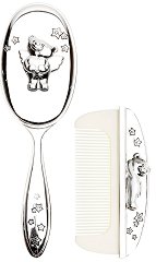 Комплектът посребрени гребен и четка за коса на Widdop Bingham е чудесен избор за най-нежната грижа за деликатната бебешка коса. Четката има мек естествен косъм, който нежно масажира скалпа, дори бебето още да няма косичка. А гребенът е със заоблени върхове, предпазващи от нараняване бебешката кожа. Гребенът и четката имат удобно оформени дръжки, което ги прави лесни за използване. Комплектът е опакован в текстилна торбичка и луксозна кутия, която го прави чудесен избор за подарък за новородено бебе, при изписване или кръщене. ...